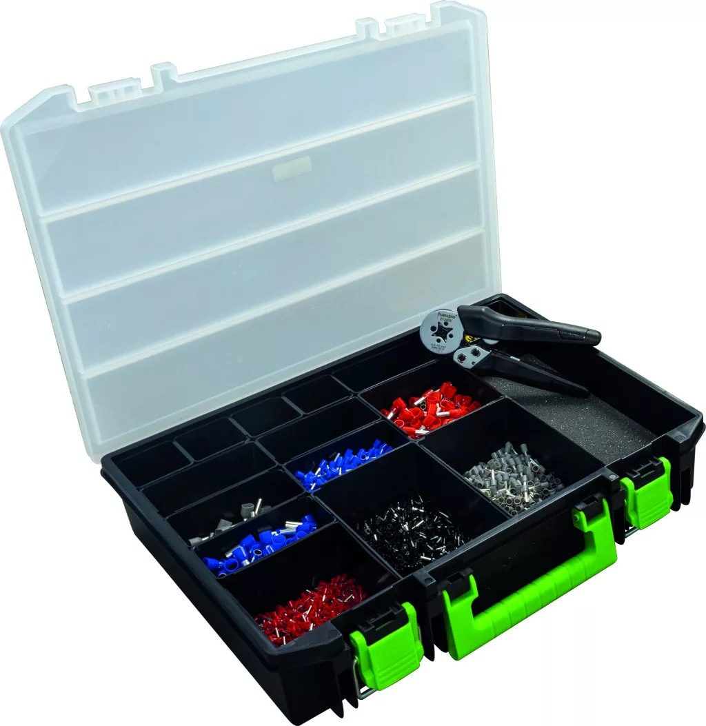 • 5200 db érvéghüvely (500x szigetelt érvéghüvely 0,5/8 fehér (270801) ; 500x szigetelt érvéghüvely 0,75/8 szürke (270802); 1000x szigetelt érvéghüvely 1/8 vörös (270805); 1000x szigetelt érvéghüvely 1,5/8 fekete (270807); 500x szigetelt érvéghüvely 2,5/8 kék (270811); 500x szigetelt érvéghüvely 4/10 szürke (270815); 200x szigetelt érvéghüvely 6/12 sárga (270818); 200x szigetelt érvéghüvely 10/12 vörös (270822); 100x szigetelt érvéghüvely 16/12 kék (270826); 100x iker érvéghüvely 0,5/8 fehér (270778); 100x iker érvéghüvely 0,75/8 szürke (270780); 100x iker érvéghüvely 1/8 vörös (270784); 100x iker érvéghüvely 1,5/8 fekete (270788); 100x iker érvéghüvely 2,5/10 kék (270792); 100x iker érvéghüvely 4,0/12 szürke (270796); 100x iker érvéghüvely 6,0/14 sárga (270797))
